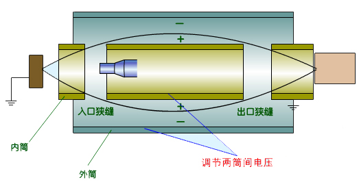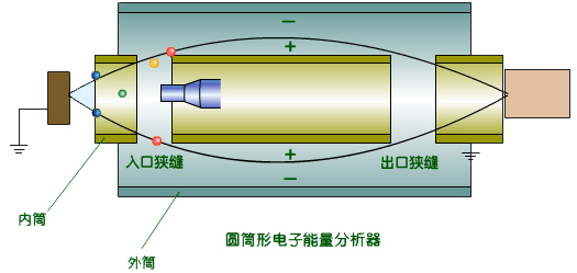 筒鏡分析器是由兩個同軸的圓筒形電極構(gòu)成的靜電反射系統(tǒng)。內(nèi)筒上開由環(huán)狀的電子入口狹縫和出口狹縫,在兩筒之間加一定的電壓。從樣品中激發(fā)的電子以一定角度從入口狹縫進(jìn)入內(nèi)筒和外筒之間的區(qū)域,調(diào)節(jié)兩筒之間的電壓,使能量滿足一定條件的俄歇電子才能通過出口狹縫,而能量不滿足條件的帶電粒子只會被內(nèi)外筒吸收。