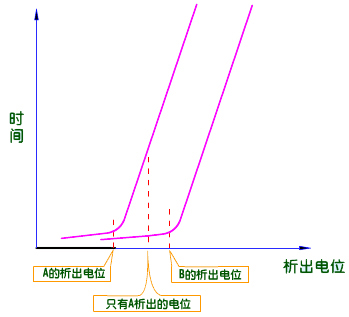 如果溶液中存在兩種金屬離子,兩金屬的析出電位分A和B,則在選擇儀器裝置的電解電位時,選擇一個處于A、B中間的電位,使得在電解時只有一種金屬析出,從而達(dá)到分離的目的。
