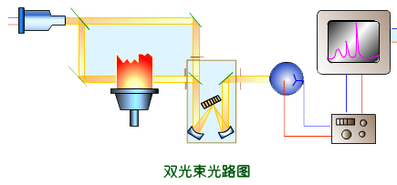 先用分束器或旋轉(zhuǎn)反射鏡將來自空心陰極燈的光束分為兩束,其中一束為試驗(yàn)光束,通過原子化器,由于被基態(tài)原子吸收而減弱;另一束為參比光束,不通過原子化器,強(qiáng)度不變。再用半透明反射鏡將兩束光合成一束光,經(jīng)過分光系統(tǒng)后進(jìn)入檢測器,經(jīng)過電子線路處理,由兩光束間的差異就可以判斷樣品中待測元素的含量。