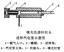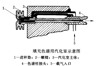 液體進(jìn)樣一般是通過(guò)汽化室把溶劑和樣品轉(zhuǎn)化為蒸汽進(jìn)入色譜柱中,液體進(jìn)樣系統(tǒng)有多種多樣,下圖是一種典型的填充色譜用汽化室。