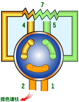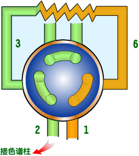六通閥處于取樣位置時(shí),載氣經(jīng)1,2兩通道直接進(jìn)入色譜柱,無(wú)樣品進(jìn)入色譜儀,氣體樣品經(jīng)通道5流入接在通道3,6上的定量管7中,經(jīng)通道4流出,使定量管充滿樣品。