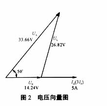 比如,在上面的試驗中施加電壓角度為50°時,作進一步分析,可以計算出保護理論動作電壓為33.66∠50°V,理論動作阻抗為4.663∠43.02°Ω,本次試驗相當于模擬了單端電源供電線路的80.75km處,發(fā)生A相經(jīng)2.848Ω電阻接地故障,可以分解為線路壓降26.82V,接地電阻上壓降14.24V,向量圖見圖2。