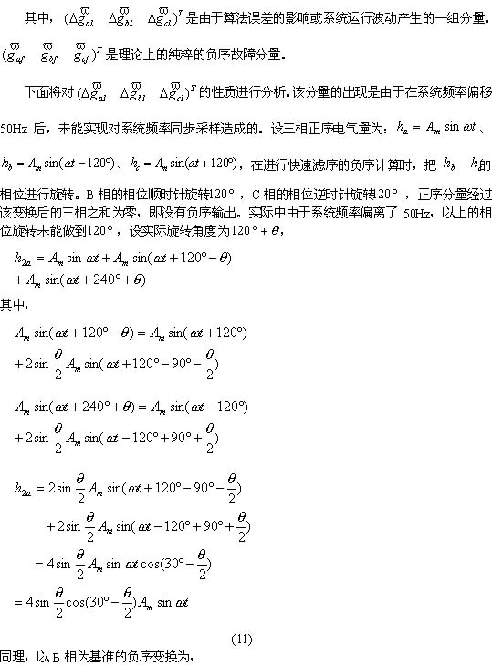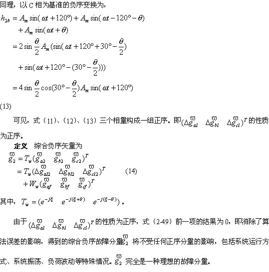 對于振蕩中的接地故障過渡電阻一般較大,220kV系統(tǒng)考慮100,500kV系統(tǒng)考慮300。伴隨著接地故障的出現(xiàn)必然有負序分量、零序分量。因此,負序分量與零序分量可以被用來識別振蕩中的接地故障[1]。該類原理存在的主要問題是如何在振蕩中準確、可靠地實現(xiàn)序分量的提取。振蕩中的系統(tǒng)頻率偏移50Hz,這對于基于50Hz采樣的保護裝置帶來一些問題。文獻[2]對于現(xiàn)有的負序算法在系統(tǒng)頻率偏移時的計算誤差進行了分析。快速的濾序算法[3]都是利用采樣序列實現(xiàn)相移的,當采樣序列不再是50Hz的同步采樣時負序的計算將有很大的虛假的輸出。只有在實現(xiàn)頻率跟蹤后,得到的負序輸出才是真實的。目前,國內(nèi)外的線路保護裝置基本上都不在硬件上實現(xiàn)對系統(tǒng)頻率的跟蹤采樣,有一些保護在軟件上采取了頻率跟蹤采樣,但頻率跟蹤都有較長的響應時間,一般用于遙測量的計算。本章從序分量的準確提取入手,提出一種基于空間變換的綜合負序矢量,該特征量具有不受系統(tǒng)頻率偏移的影響,對于反映在振蕩過程中由于不對稱故障產(chǎn)生的負序分量具有很高的靈敏度,與零序分量相配合能夠識別出振蕩中的高阻接地。