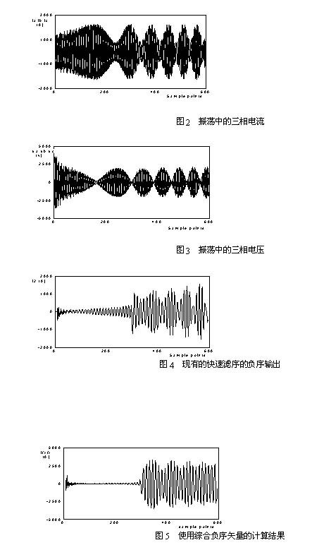 圖2、圖3給出系統(tǒng)振蕩及振蕩中再故障的三相電流、三相電壓。圖2-4為在圖1所示系統(tǒng)的線路末端C點發(fā)生經(jīng)300過渡電阻的A相接地情況時的使用傳統(tǒng)的快速濾序算法的電流負序分量[114]。圖5為線路末端C點發(fā)生經(jīng)300過渡電阻的A相接地情況時的綜合負序矢量輸出?梢娋C合負序算法對于振蕩中系統(tǒng)的頻率偏移不敏感,計算出的負序分量能夠是真實的、可靠的。