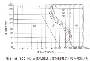 交流電流通過人體的電流-時(shí)間效應(yīng)分區(qū)如圖1所示。