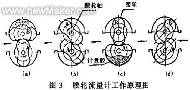 腰輪流量計(jì)又稱羅茨或轉(zhuǎn)動(dòng)流量計(jì),當(dāng)氣體由進(jìn)口流進(jìn),在進(jìn)出口壓差作用下,處于圖3a位置時(shí),腰輪A上的合成力矩不平衡,故腰輪A不能轉(zhuǎn)動(dòng)。而腰輪B上的合成力矩不平衡,故腰輪B按順時(shí)針方向轉(zhuǎn)動(dòng),同時(shí)把計(jì)量室內(nèi)的氣體排向出口,與此同時(shí)腰輪B轉(zhuǎn)軸上的驅(qū)動(dòng)齒輪帶動(dòng)了腰輪A轉(zhuǎn)軸上的驅(qū)動(dòng)齒輪,使腰輪A按逆時(shí)針方向轉(zhuǎn)動(dòng),逐漸由圖3b位置到達(dá)圖3c位置,同樣通過兩腰輪上所受力矩和轉(zhuǎn)動(dòng)過程則形成圖3d位置,兩腰輪如此主從交替轉(zhuǎn)動(dòng),腰輪旋轉(zhuǎn)一周就有四個(gè)如圖中陰影部分容積的氣體排出,通過腰輪的轉(zhuǎn)數(shù)和齒輪減速系統(tǒng),輸進(jìn)到指示機(jī)械從而顯示出氣體的總流量。如圖3所示。