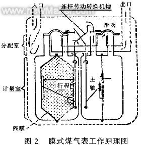膜式煤氣表工作原理:在儀表進(jìn)出口的壓差作用下,氣體通過滑閥和分配室,使兩個(gè)計(jì)量室的隔膜形成交替進(jìn)排氣的往復(fù)運(yùn)動(dòng);廣州市駿凱電子科技有限公司各自往復(fù)進(jìn)排氣一次巡回體積為一額定值即一回轉(zhuǎn)體積量(V1);與此同時(shí)連接于隔膜主軸上的傳動(dòng)轉(zhuǎn)換機(jī)構(gòu),將隔膜一回轉(zhuǎn)的次數(shù)連續(xù)輸進(jìn)到計(jì)數(shù)機(jī)構(gòu),進(jìn)行流量累計(jì),從而顯示出氣體流出的總量。如圖2所示。