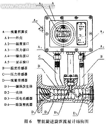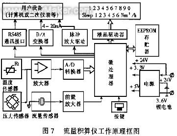 除采用上述修正方式外,也可將(1)式、(10)式綜合融進(jìn)智能一體化設(shè)計(jì),使儀表直接顯示出標(biāo)態(tài)下的流量,例如:智能旋進(jìn)旋渦流量計(jì),其結(jié)構(gòu)圖見圖6,其流量積算原理圖見圖7;氣體渦輪流量計(jì)和卡門渦街流量計(jì)均可按此結(jié)構(gòu)形式和原理進(jìn)行一體化設(shè)計(jì)。
