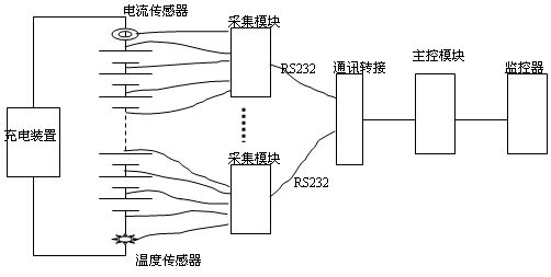 在電力系統(tǒng)變電站目前使用較多的蓄電池在線監(jiān)測(cè)裝置是電池巡檢儀,電池巡檢儀又分為兩種,一種是丈量蓄電池單體電壓的巡檢儀,結(jié)構(gòu)是由一個(gè)主控模塊和數(shù)個(gè)采集模塊組成,主模塊接收監(jiān)控器的命令,發(fā)送電池?cái)?shù)據(jù)到直流設(shè)備的監(jiān)控器;采集模塊中每個(gè)模塊采集10~20節(jié)電池的電壓、電流和溫度;通過(guò)直流充電設(shè)備的監(jiān)控器可顯示各單節(jié)電池電壓,判定故障電池的編號(hào)且給出報(bào)警。這類電池巡監(jiān)儀一般由直流設(shè)備生產(chǎn)廠家提供,在訂貨直流設(shè)備時(shí)它是選配裝置,由于功能單一、不能測(cè)試容量、且丈量精度差、輕易誤報(bào),限制了它的廣泛使用。測(cè)試示意圖如圖1: