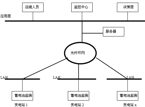 蓄電池在線監(jiān)測(cè)還可以利用通訊手段進(jìn)行網(wǎng)絡(luò)化治理(如圖4),將幾個(gè)站或一地區(qū)的蓄電池監(jiān)測(cè)通過(guò)光纖進(jìn)行組網(wǎng),建立一個(gè)實(shí)時(shí)遠(yuǎn)程智能化蓄電池監(jiān)測(cè)網(wǎng)絡(luò)化治理系統(tǒng),以實(shí)現(xiàn)信息集中和遠(yuǎn)程控制,使運(yùn)行檢驗(yàn)職員、相關(guān)職員和治理決策層能夠通過(guò)局域網(wǎng)內(nèi)的任何一個(gè)終端用IE瀏覽的方式即可實(shí)時(shí)把握各變電站蓄電池的運(yùn)行情況及其性能變化趨勢(shì),使蓄電池得到及時(shí)的維護(hù),同時(shí)也為“設(shè)備狀態(tài)檢驗(yàn)”提供可靠依據(jù),將“定期維護(hù)檢驗(yàn)”轉(zhuǎn)變?yōu)椤盃顟B(tài)檢驗(yàn)”,從而實(shí)現(xiàn)對(duì)蓄電池的科學(xué)化治理,保證系統(tǒng)的可靠、安全運(yùn)行。