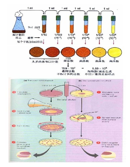 2.2 傳統(tǒng)菌落技術(shù)法 菌落總數(shù)的測定,一般將被檢樣品制成幾個不同的10倍遞增稀釋液,然后從每個稀釋液中分別取出1mL置于滅菌平皿中與營養(yǎng)瓊脂培養(yǎng)基混合,在一定溫度下,培養(yǎng)一定時間后(一般為48小時),記錄每個平皿中形成的菌落數(shù)量,依據(jù)稀釋倍數(shù),計算出每克(或每ml)原始樣品中所含細(xì)菌菌落總數(shù)。(以下圖片均來自于互聯(lián)網(wǎng))