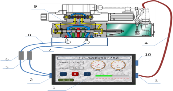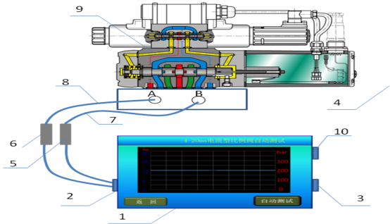 1、在線判斷液壓控制閥設(shè)備故障;在現(xiàn)代化的生產(chǎn)線包含有液壓控制閥的設(shè)備一旦出現(xiàn)故障,普通員工很難判斷是機械故障、液壓故障還是電氣控制故障;該儀器可解決上述問題,一步,斷開與液壓控制閥相連的電氣插頭,把本儀器配套的插頭插上,二步,將壓力傳感器的兩根測壓線連接到液壓控制閥的A、B口測壓點上,三步,打開本儀器電源,選擇與液壓控制閥相對應(yīng)的信號,手動測試即可判斷是機械故障、液壓故障還是電氣控制故障;如下圖: