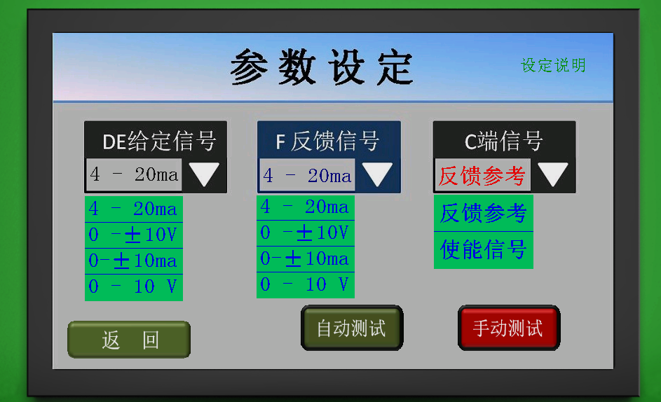 2、信號采取智能切換,大輸出20ma恒流的方式,即使負載短路都不會損壞本儀器,智能切換和參數(shù)設(shè)定見下圖: