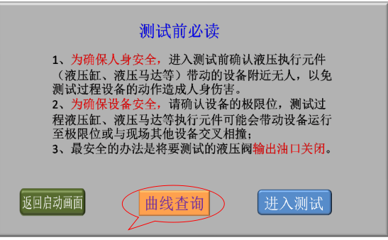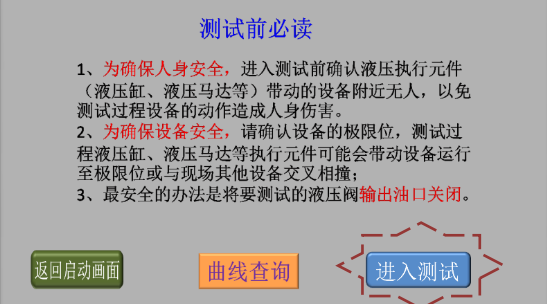 3、確認(rèn)現(xiàn)場(chǎng)人員和設(shè)備安全后,點(diǎn)擊“進(jìn)入測(cè)試”,進(jìn)入液壓閥測(cè)試類型選擇畫面;