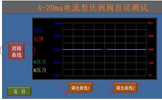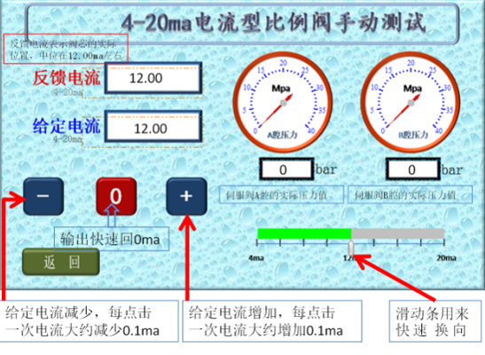 6、比例閥正常時(shí)的表現(xiàn)為:a、給定電流12.00ma時(shí),反饋電流在12.00ma,比例閥輸出的A、B腔壓力相同;b、用滑動(dòng)條可迅速換向,反饋電流改變且A、B腔壓力差較大;c、點(diǎn)擊增加按鈕,反饋電流逐漸增加且A、B腔壓力差逐漸增大;d、點(diǎn)擊減少按鈕,反饋電流逐漸減少且A、B腔壓力差逐漸減少,過(guò)12.00ma后比例閥會(huì)換向;