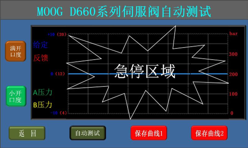 自動測試過程中出現(xiàn)緊急情況,可點(diǎn)擊屏幕中間黑色的曲線部分,儀器將給伺服閥斷電,重新選擇開口度后儀器會再次給伺服閥上電;