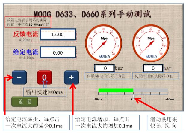 6、伺服閥正常時的表現(xiàn)為:a、給定電流0ma時,反饋電流在12.00ma,伺服閥輸出的A、B腔壓力相同;b、用滑動條可迅速換向,反饋電流改變且A、B腔壓力差較大;c、點(diǎn)擊增加按鈕,反饋電流逐漸增加且A、B腔壓力差逐漸增大;d、點(diǎn)擊減少按鈕,反饋電流逐漸減少且A、B腔壓力差逐漸減少,過0ma后伺服閥會換向;